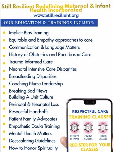 We invite you to schedule a conference call or virtual appointment with our representatives to discuss your team’s Implicit Bias and Equity Training needs. Our dedicated team is committed to providing tailored, evidence-based training programs designed to align with your organization’s specific goals. Once we receive your request, we will promptly follow up to arrange a meeting at a convenient time. Together, we can explore how our training initiatives can support your organization's journey in promoting respectful maternal and infant care outcomes for both staff and clinicians.